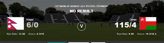 बेलफास्टमा टस जितेर नेपालले फिल्डिङ रोजेको थियो । ओमानले १६.३ ओभरमा ११६ रन बनाउँदा पानी परेपछि खेल रोकियो । ओमानका जिशान मकसुदले ३१ बलमा चार चौका र ३ छक्काको मदतमा ४४ रन बनाए । भैरव वाटेगावश्करले २३ र खवर अलीले २२ रन बनाए । नेपालका शक्ति गौचन, जितेन्द्र मुखिया, सागर पुन र ज्ञानेन्द्र मल्लले समान १-१ विकेट लिए ।