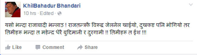 चार दलले ६ प्रदेशको सीमांकनमा सहमति जनाएलगत्तै एमाओवादी समर्थित क्रान्तिकारी पत्रकार खिलबहादुर भण्डारीले राति नै आक्रोशित हुँदै फेसबुकमा यस्तो स्टाटस लेखे- ‘यसोभन्दा राजावादी भन्लाऊ, राजतन्त्रकै विरुद्ध जेलनेल खाइयो, दुःख-कष्ट पनि भोगियो, तर तिमीहरुभन्दा त महेन्द्र धेरै बुद्धिमानी र दुरगामी ! तिमीहरु त ईश !’